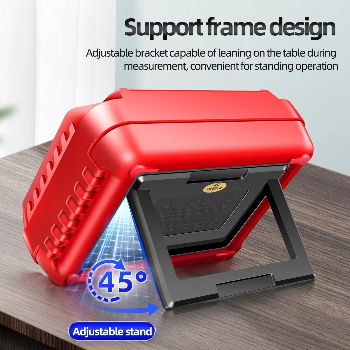 Hier ist noch mehr! Die schützende Silikonhülle sorgt für Langlebigkeit in anspruchsvollen Umgebungen. Eine praktische Rückhalterung ermöglicht den freihändigen Betrieb während längerer Tests. Darüber hinaus umfasst das intelligente Energiemanagement eine automatische Abschaltung und Batteriewechselüberwachung.
