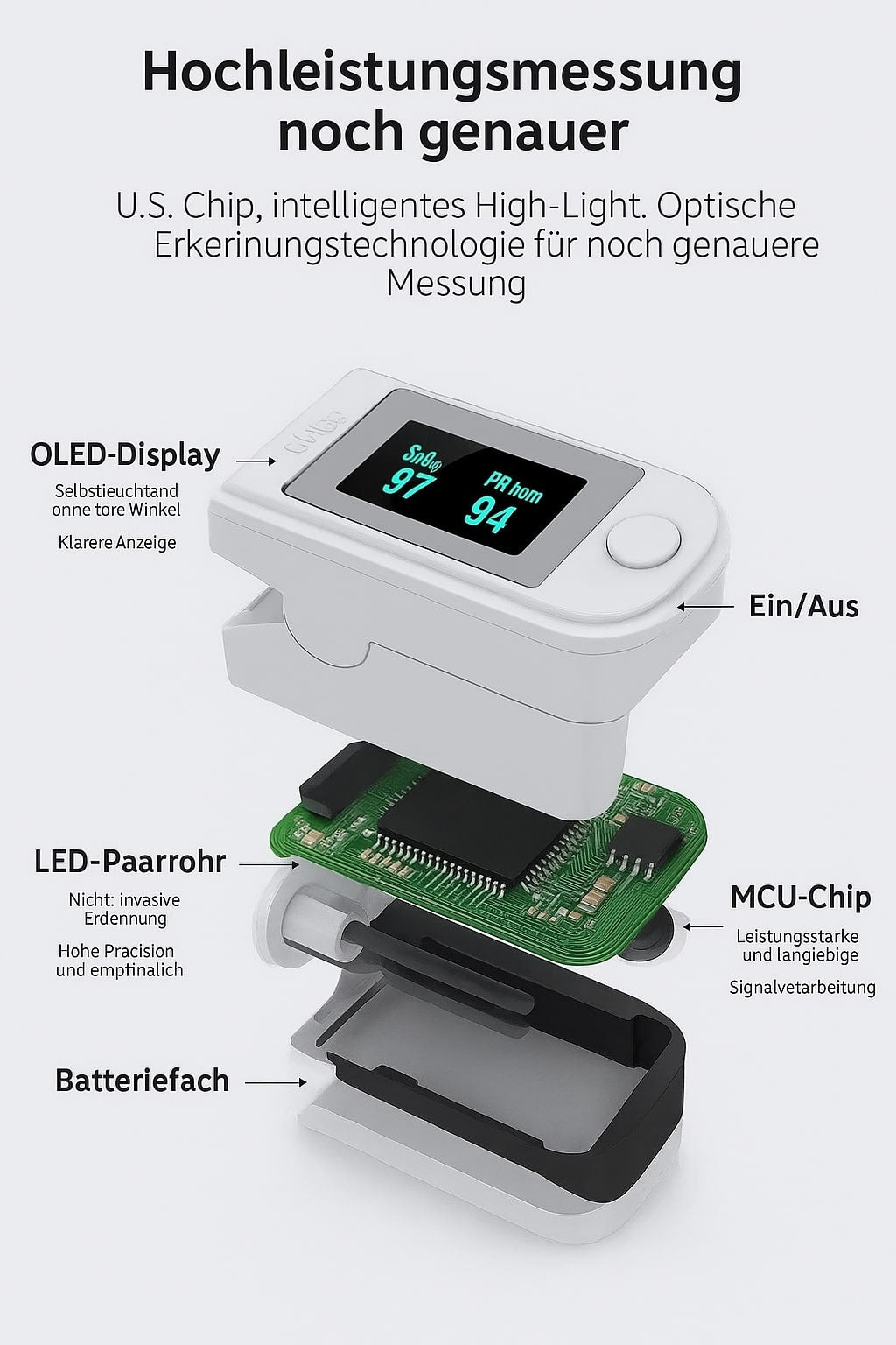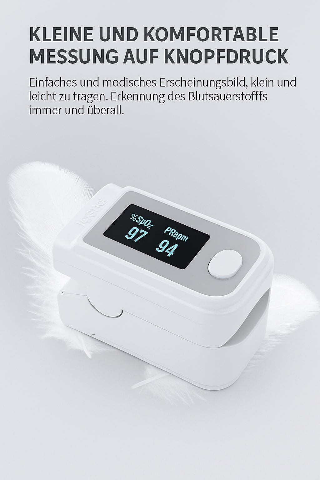 • Messfunktionen: Sauerstoffsättigung (SpO₂), Pulsfrequenz