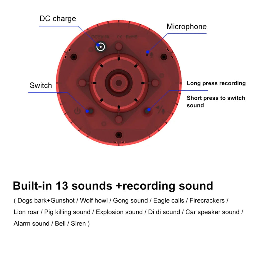 - Gibt hochfrequente Alarme und 13 rotierende Geräusche als zuverlässiges Vogelabwehrmittel aus