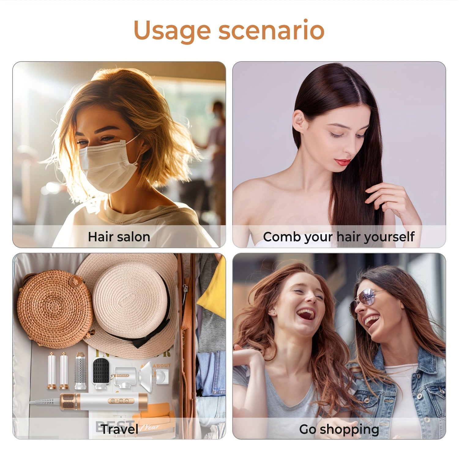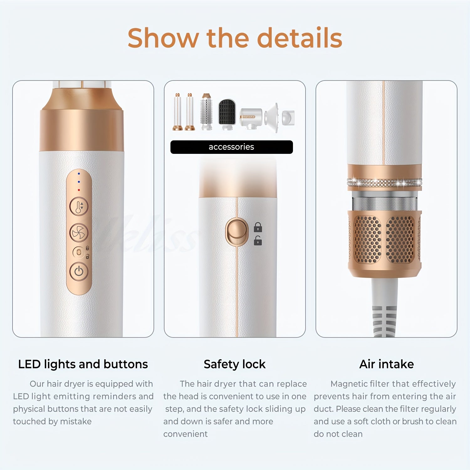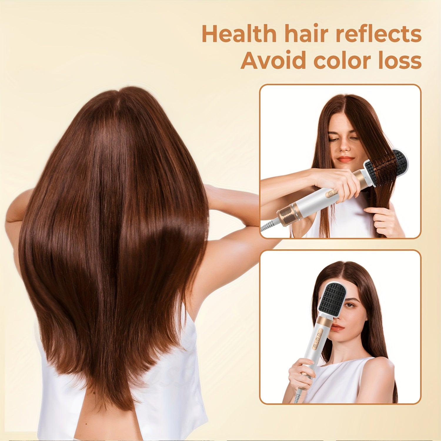 • 7‑in‑1 Vielseitigkeit: abnehmbare Aufsätze für Föhnen, Glätten, Locken und Volumen.