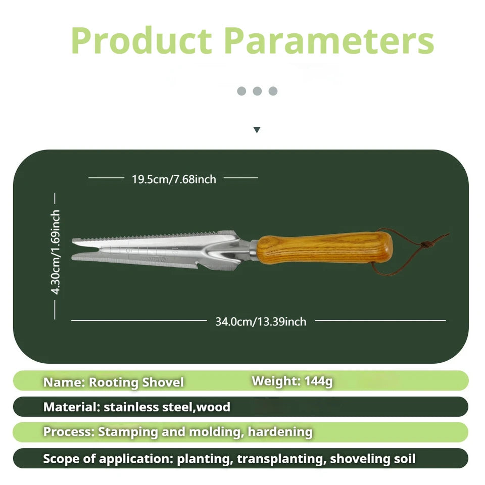 Im Mittelpunkt seines Designs steht ein langlebiger Edelstahlkopf mit einer scharfen V-Kante, der mühelos als zuverlässiges Unkrautwerkzeug funktioniert und ideal für das Entfernen von tief verwurzeltem Unkraut ist. Das in die Schaufel eingravierte Tiefenmaß ermöglicht präzises Pflanzen und Umpflanzen, während die gebogene Kerbe als Schnitthilfe oder Flaschenöffner fungieren kann – perfekt für beschäftigte Gärtner.